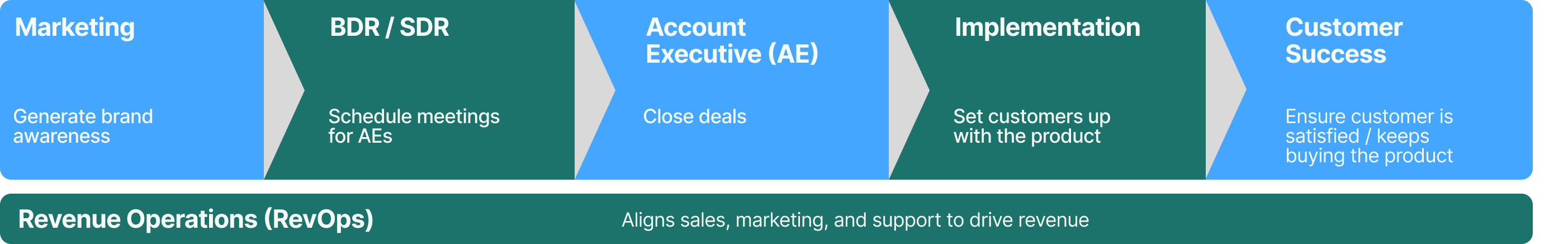 Customer Success: Making sure customers stay happy, keep using the product, and expand their contract over time.