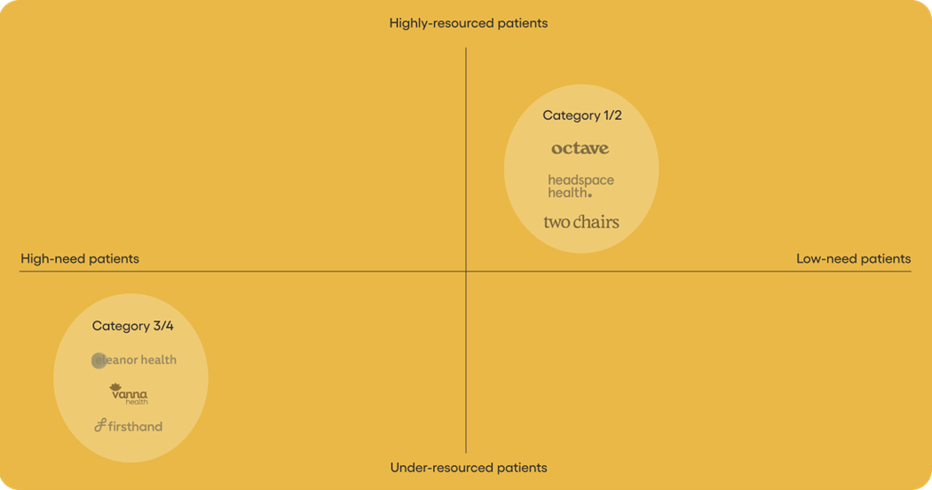 Companies in the bottom-left in the diagram below cater to this under-resourced patient population. As mentioned above, these patients tend to accrue higher medical costs over time, incentivizing health plans and providers to engage in shared savings models and population-based-payments. On the other hand, companies that cater to patients with less severe conditions and higher socioeconomic statuses generally fall into the first and second category, as they are not as costly to health plans.