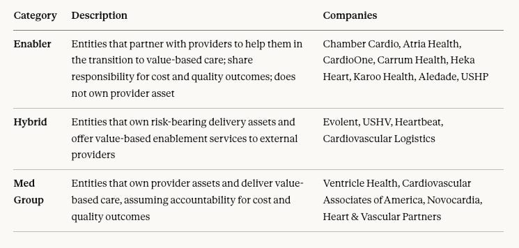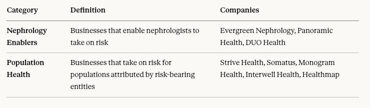 These policy tailwinds have created two primary business models in value-based kidney care: nephrology enablers and population health. KCC, the CMMI model, gave rise to many businesses focused on enabling nephrologists to take on risk, similar to what Aledade or other enablers do for PCPs (noticing a trend?). Most of these businesses create Kidney Care Entities (KCEs) (similar to ACOs) in Traditional Medicare. Businesses that only enable nephrologists are in the full-risk nephrology bucket. The population health bucket includes businesses that enter full-risk arrangements with payers, some of which also serve as enablers for nephrologists.